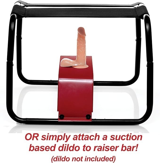 Choose between a bouncy seat, or a sturdy, cushioned seat... Then choose between a sex machine, your favorite dildo, or your partners face! The new 4 in 1 banging bench is more versatile than ever, with a new way to get comfortable and a new way to get banged. Indulge in hands-free ecstasy with a removable sex machine that can even be used on its own! Snap the padded cushions in place and then secure the base of the machine with the included suction cups so that the dildo is sticking up in your desired location. The optional extension bar is even flexible so that you can aim the dong to your ideal angle. The included dildo is firm the way you want it, but soft and flesh-like with a veiny texture and a bold head. The vacuum-grip attachment can be used with other compatible dildos so that you can customize your ride. Use the wired multi-speed dial to explore penetration at up to 150 thrusts per minute. You can also adjust the thrust length from 1 inch to 3.5 inches. Feel like taking even more control? Attach your favorite suction cup dildo to the red metal Riser, or use the included harness to secure a wide-based dong and bounce up and down on the stretchy seat straps to screw yourself. Use it on your own for penetrating intensity on your terms, or put on a show for your partner to show them what takes you over the edge. You can even remove the Raiser bar and the sex machine and use it as a queening stool, straddling your lovers face while they pleasure you from below! The banging bench is easy to set up and discreet to store, with a durable steel frame that is built to last. The included dildo is compatible with silicone and water-based lubricants. Clean after use with mild soap or toy cleaner. Measurements: bench is 14.5 inches in height, 19 inches in width, 18 inches in depth. Red Raiser is 5.25 inches in height, 4.75 inches in depth. Sex machine is 7 inches in height. Extender is 4 inches in length. Dildo is 7.25 inches in length, 1.75 inches in diameter. Material: Metal, ABS, elastic, PU leather, foam, wood, TPE. Color: Black. Note: Includes machine dildo, but suction cup dildo is sold separately. Machine uses 240 volt power cord, included