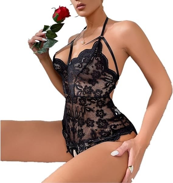 Women's Backless Sexy Lingerie Strap Bodysuit Halter Deep V Neck Teddy Lace Babydoll Underwear Nightwear